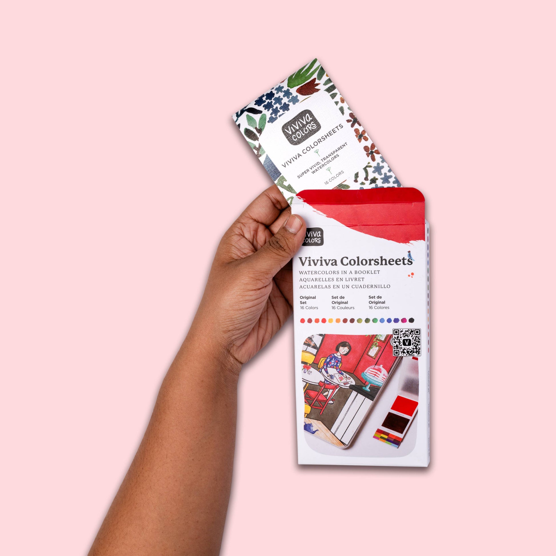 Meet the Viviva Original Colorsheets: a portable set of 16 vibrant watercolors you can paint anywhere—from a cafe table to a scenic hillside. It includes an inbuilt reusable mixing palette, water-resistant sheets to keep colors separate, and color-coded sheets for easy, mess-free painting—designed to be fun and effortless.